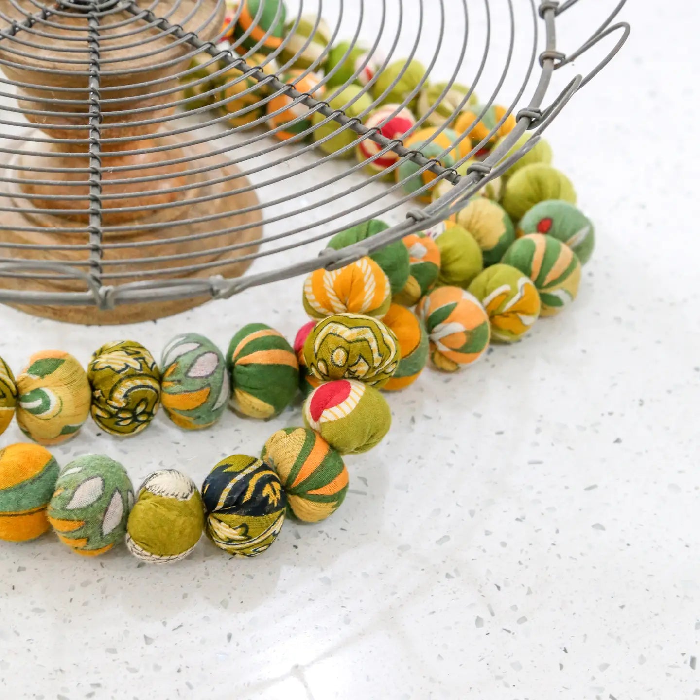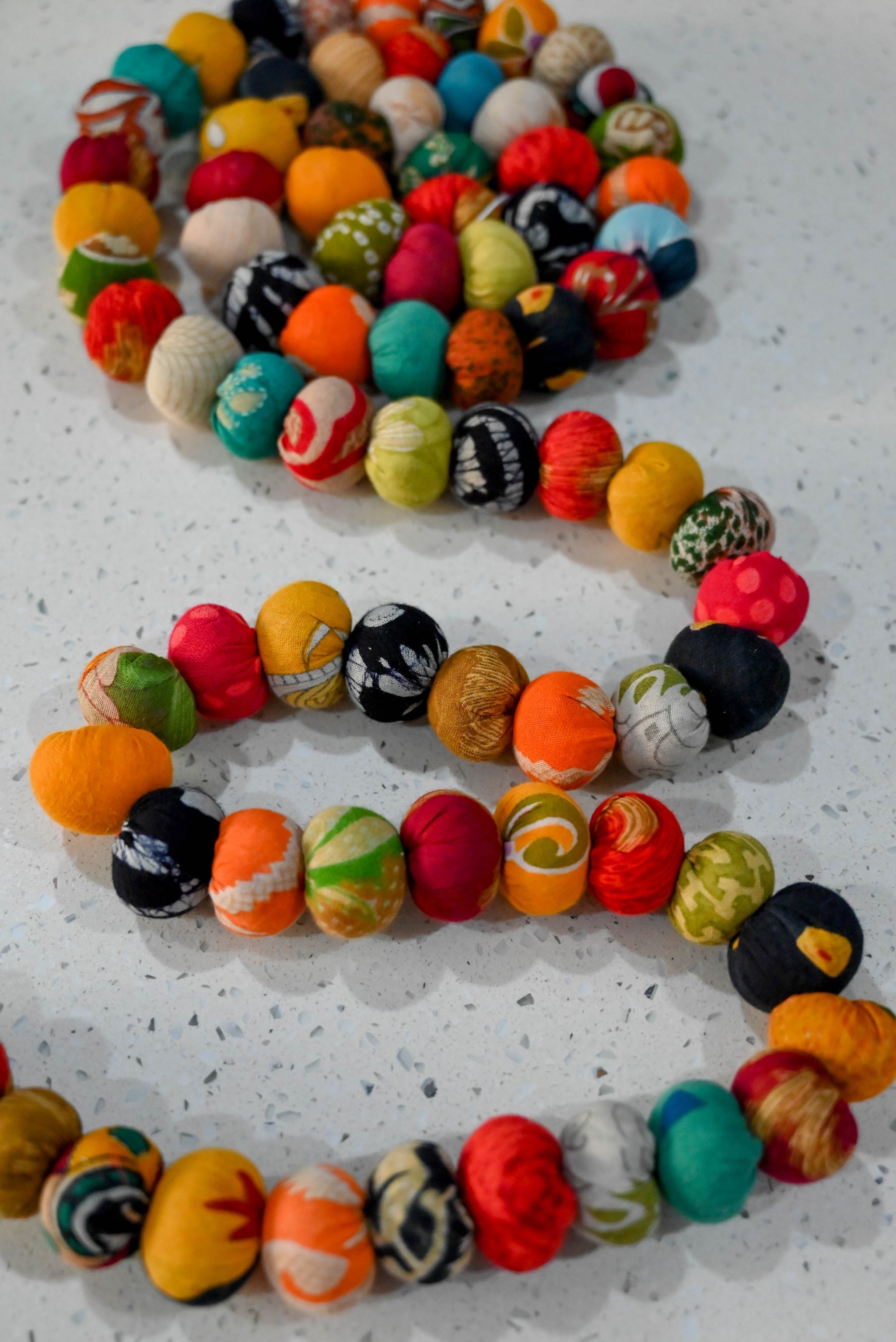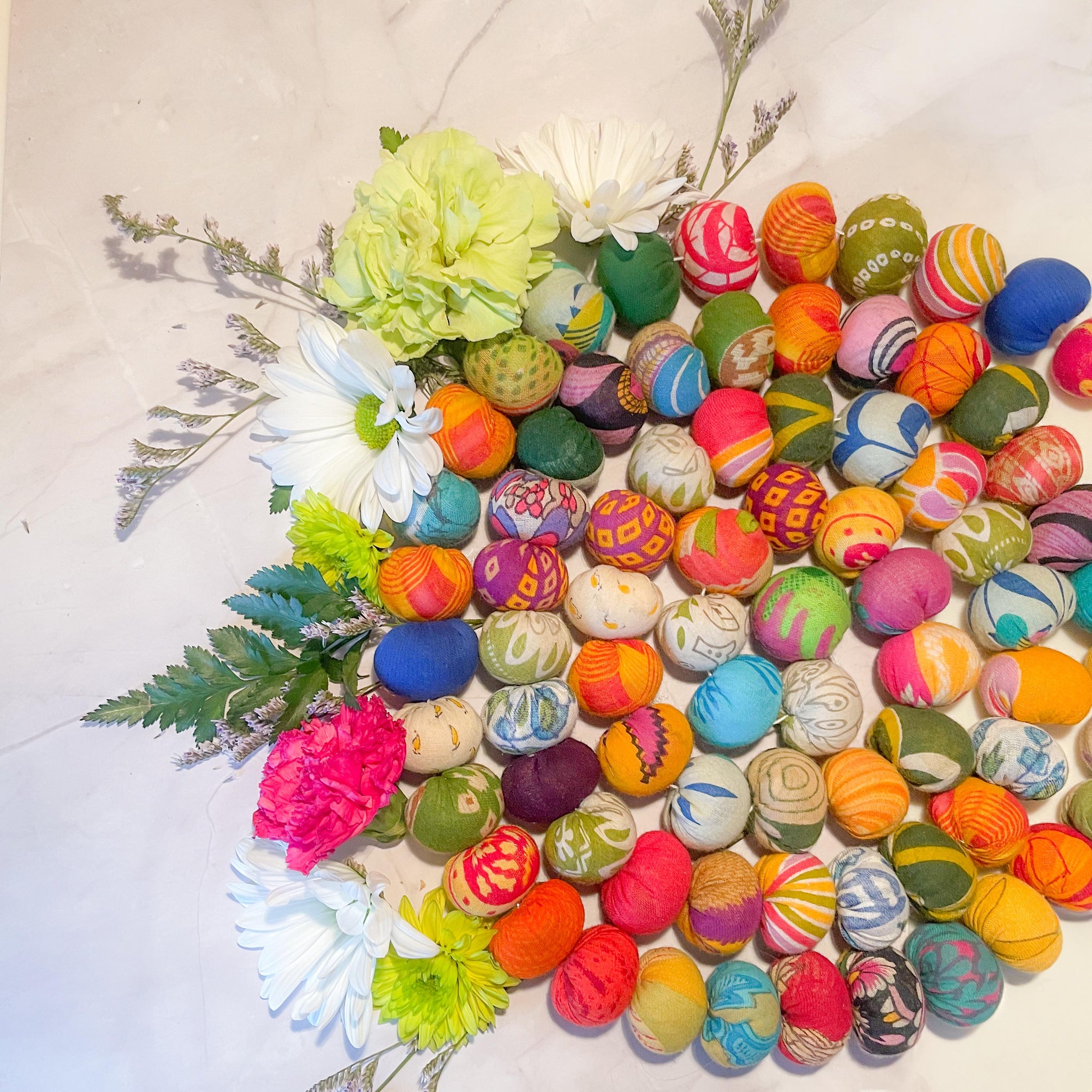 Our assorted Spring tone garlands begin with our artisans cutting recycled sarees and hand stitching them bead by bead, making each one unique and eco-friendly. Carefully selected beads from overflowing...
