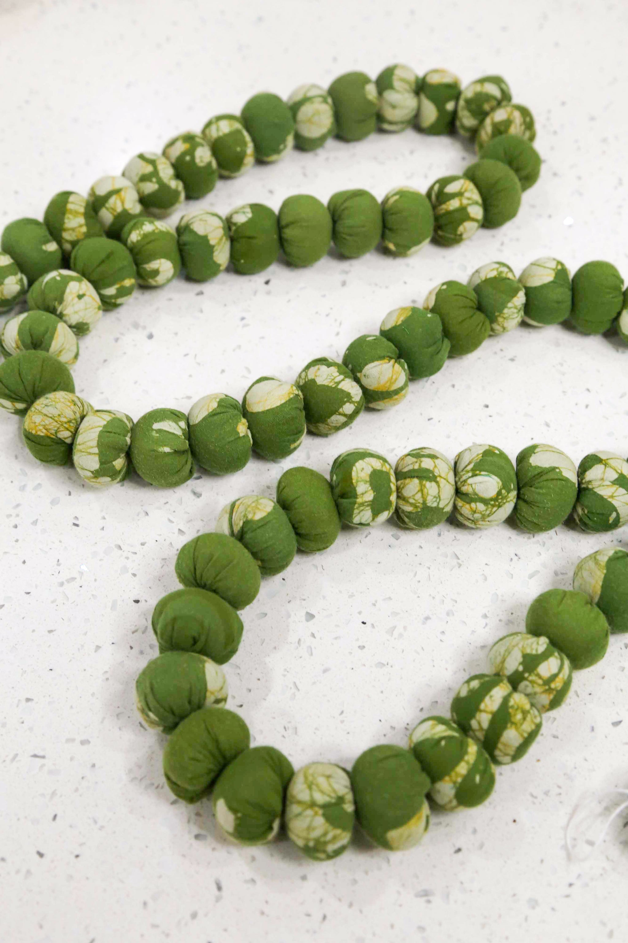 These stunning assorted green garlands begin with our artisans cutting recycled sarees and hand stitching them bead by bead, making each one unique and eco-friendly. Carefully selected beads from overflowing...