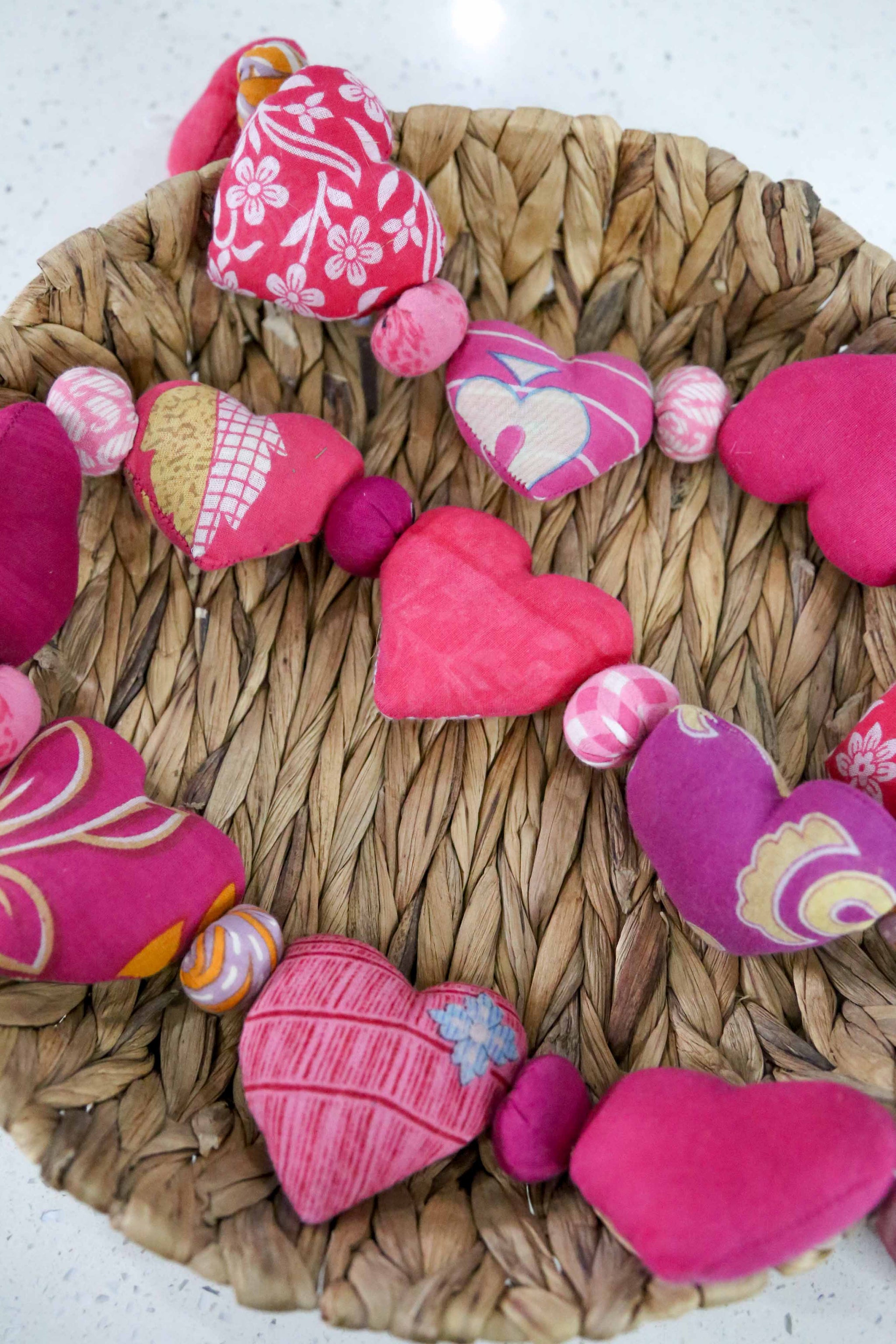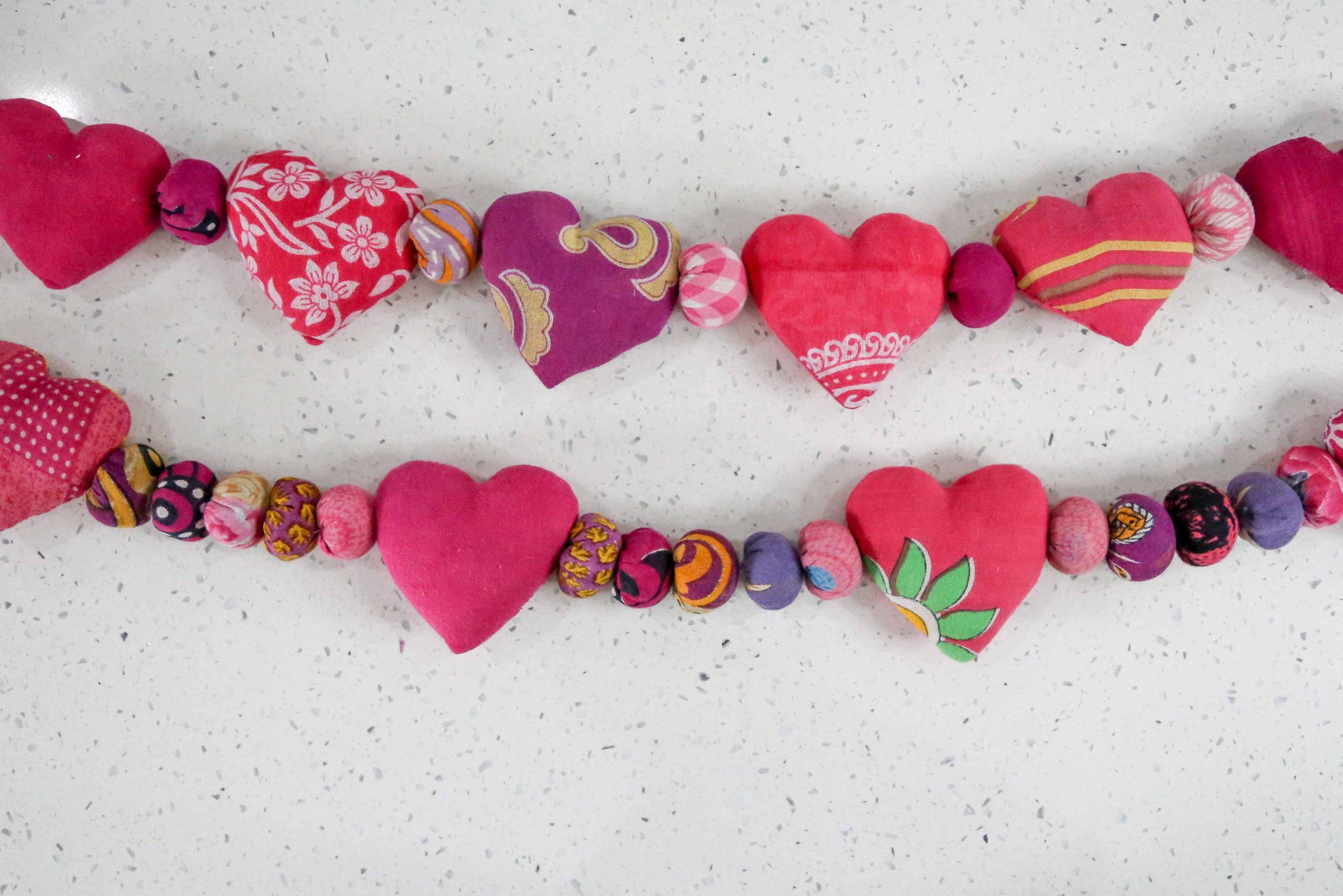 These beautiful assorted single-pattern Valentine garlands are carefully hand-stitched, bead by bead, using recycled saree scraps. Each bead is made from the same saree pattern, creating a cohesive and harmonious...