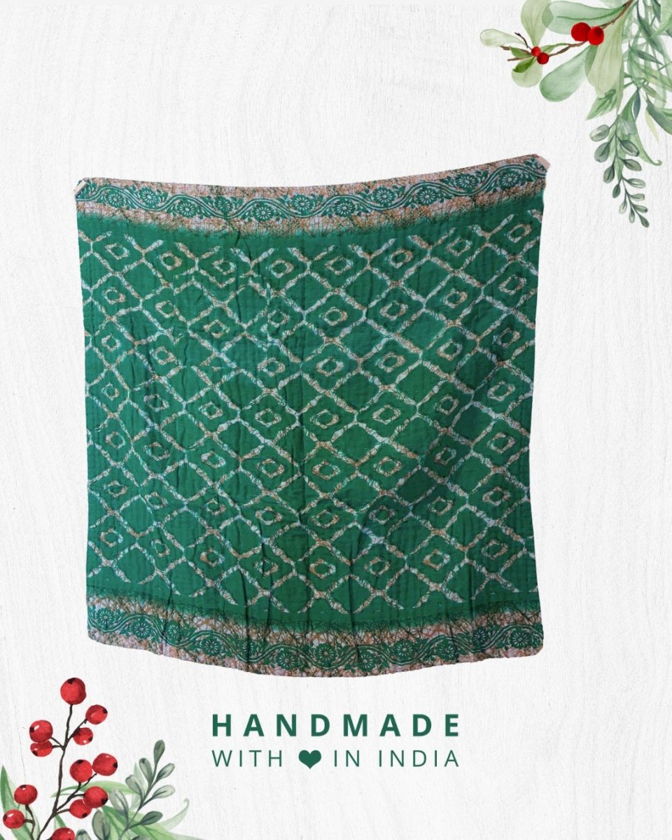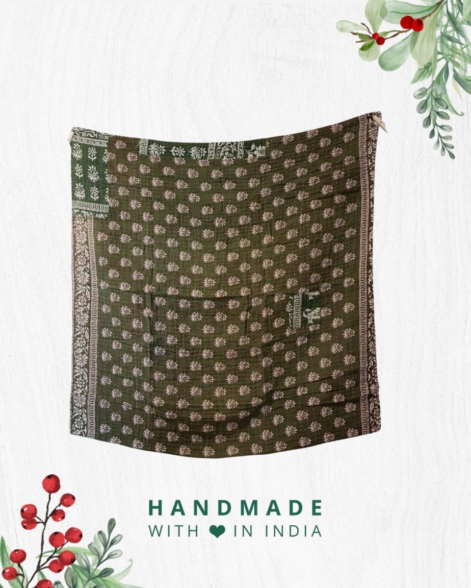Kantha is a traditional stitch done in West Bengal where line after line of thread is stitched across the length of a recycled saree material. Our Kantha stitched blankets are...