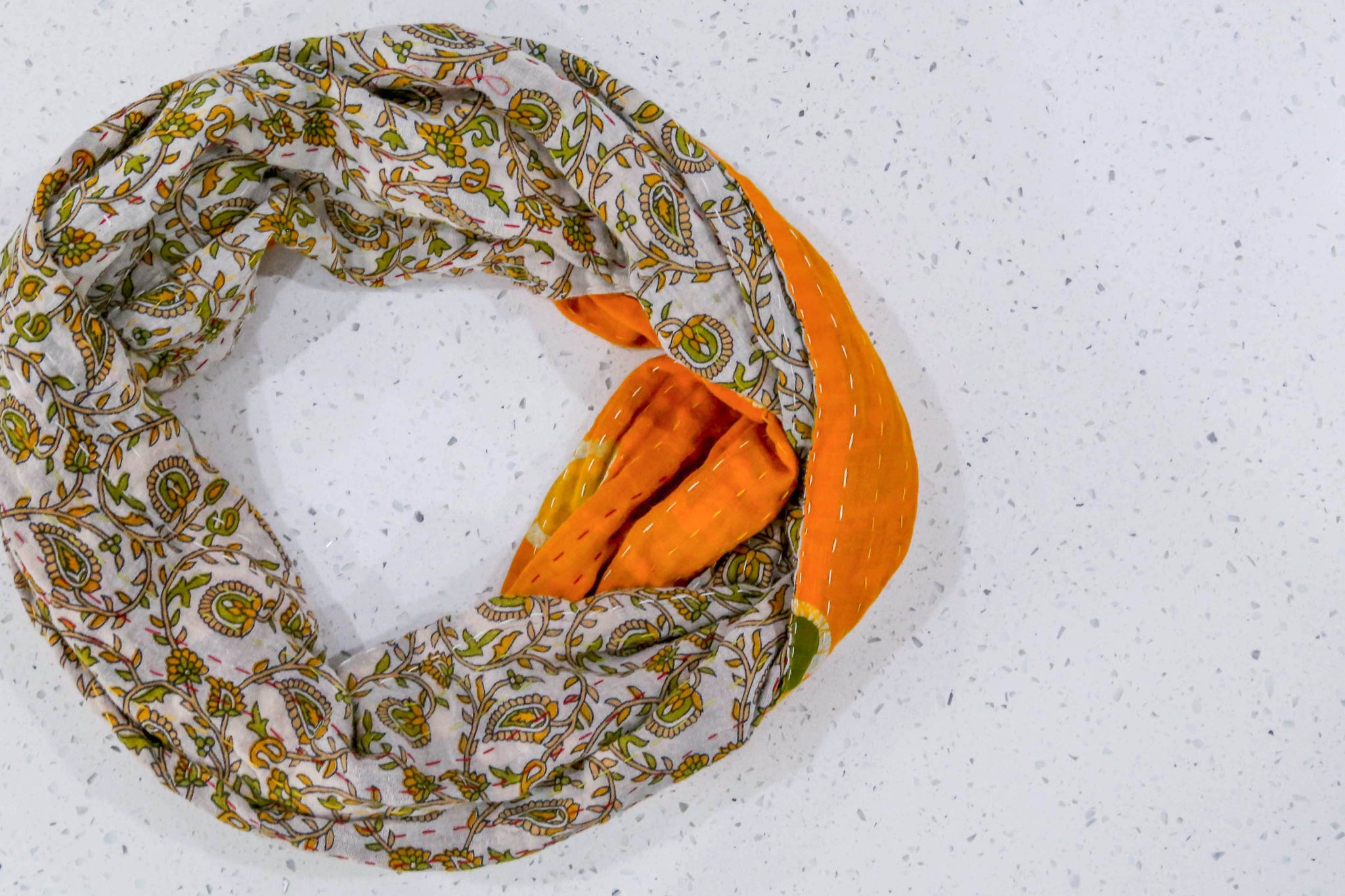 Recycled saree makes such an amazingly warm and cozy infinity scarf! Our Kantha Infinity Scarves are hand stitch with two coordinating saree fabrics to help brighten up your fall and...