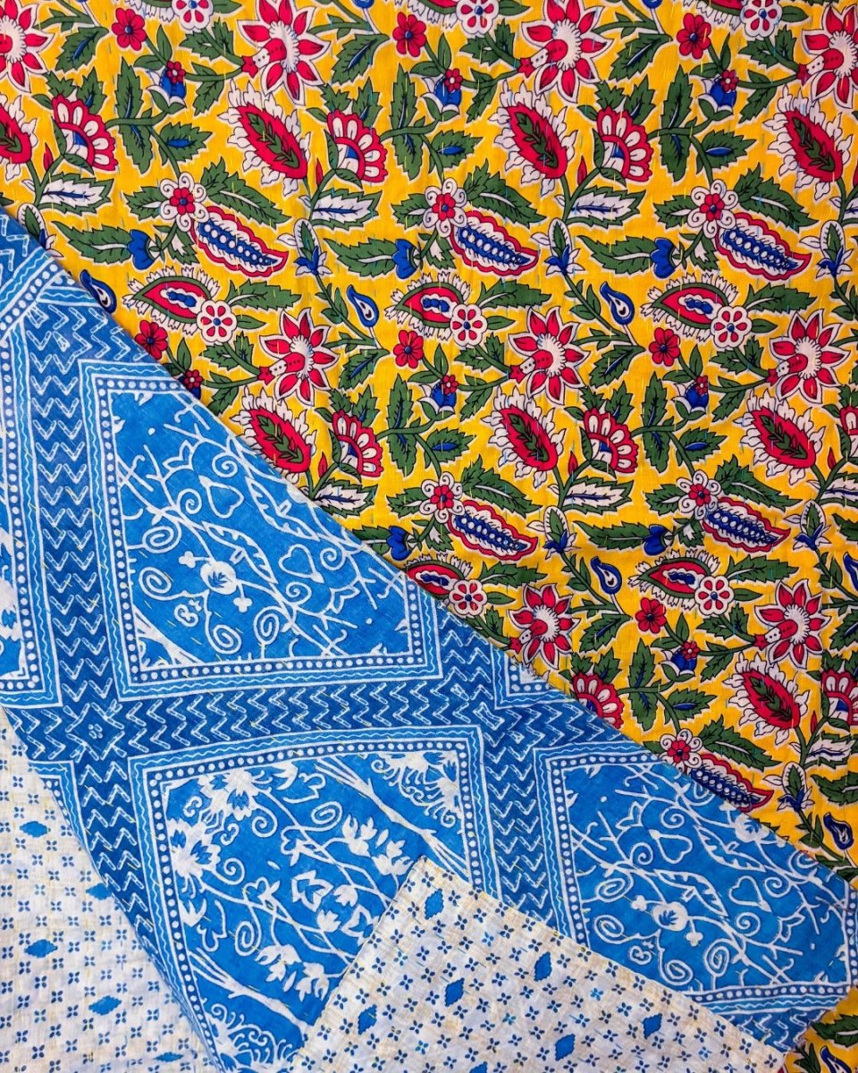 Kantha is a traditional stitch done in West Bengal where line after line of thread is stitched across the length of a recycled saree material. Our Kantha stitched blankets are...